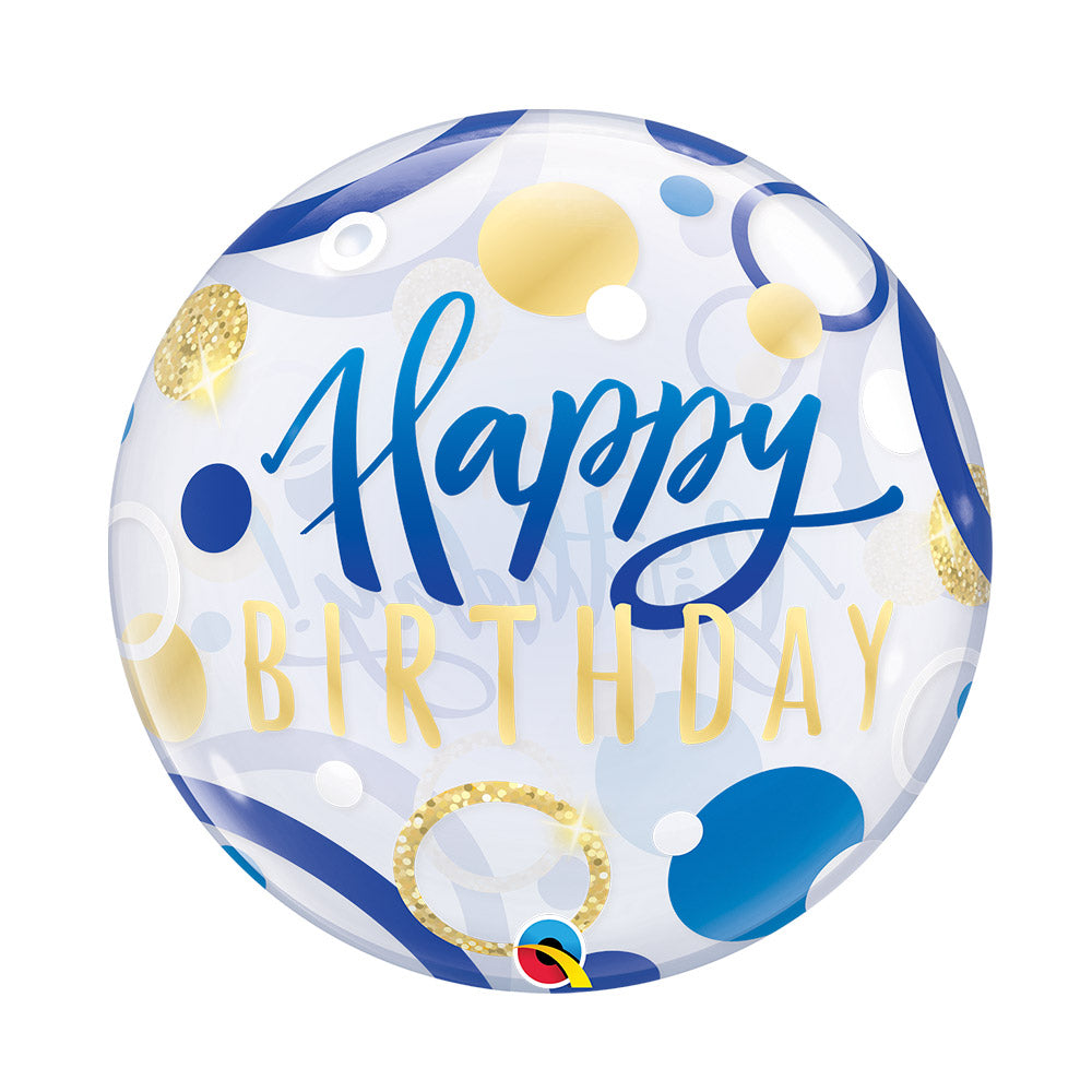 Globo burbuja transparente azul y dorado happy birthday 22" (55 cm) Qualatex